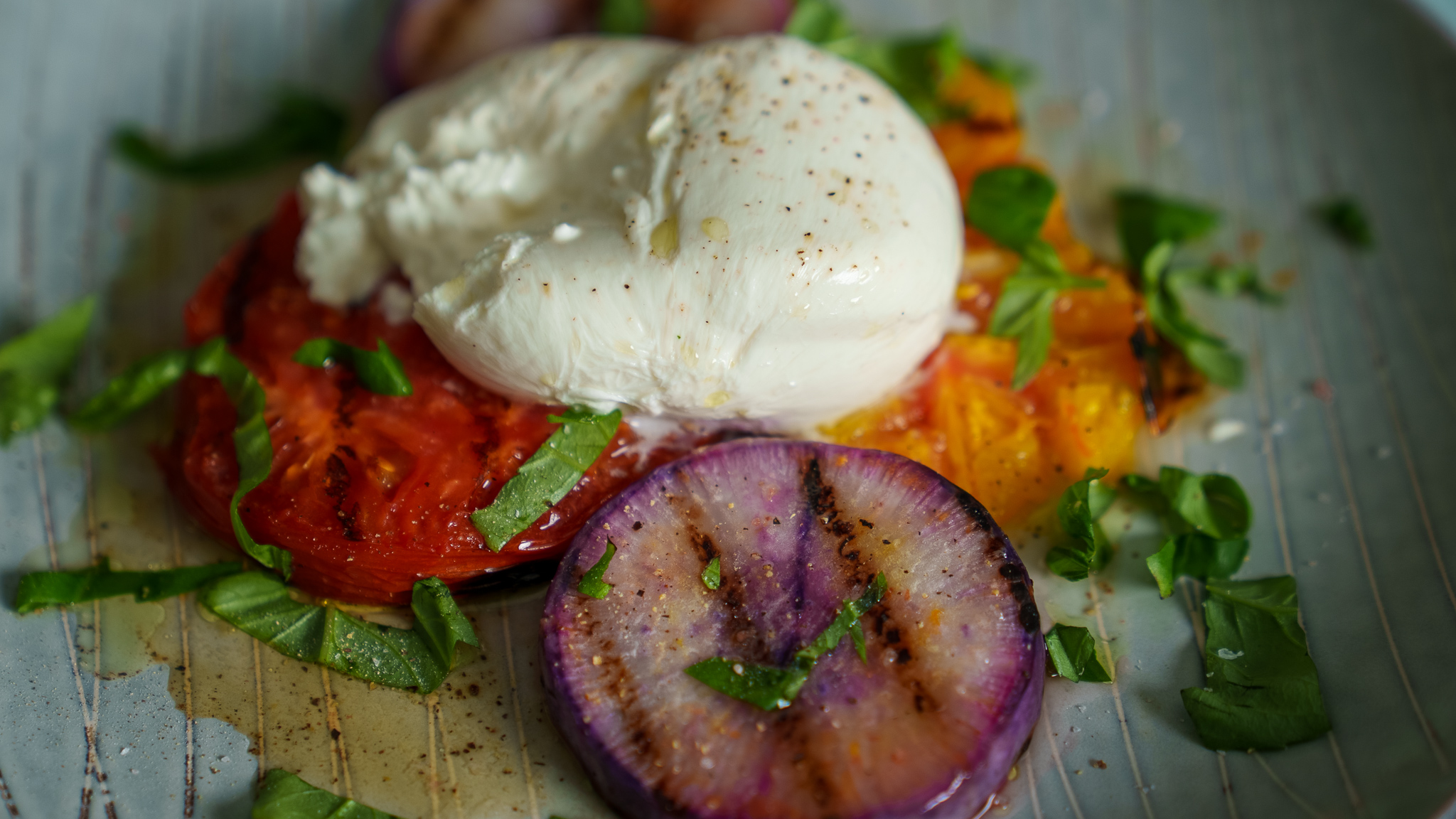 Grilled Heirloom Tomato & Purple Daikon Burrata Salad