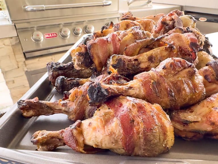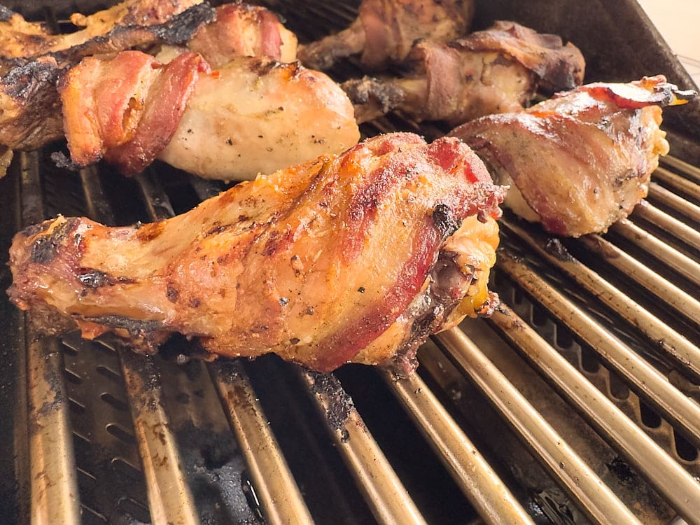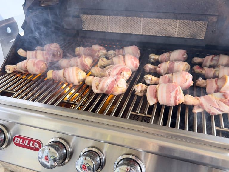 Bacon-wrapped anything grilled on a Bull Grill is always a winner in my book! Chicken drumsticks are extremely flavorful and loaded with great flavor, especially when wrapped in bacon. The prep needed to grill bacon-wrapped chicken drumsticks is very easy. Marinating the chicken drumsticks before isn’t necessary, but it will add more depth to the chicken.