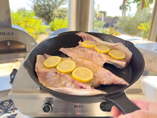 Branzino is a delicate Mediterranean fish that shines when cooked simply, allowing its natural flavors to come through. This recipe takes advantage of the Bull Dual Fuel Countertop Pizza Oven‘s consistent heat and even distribution to create perfectly crisp skin while keeping the interior moist and tender. By cooking the fish in a cast iron pan at 400°F, the pizza oven’s steady heat enhances the infusion of herbs, garlic, and lemon, giving the dish a subtle, smoky depth. The Bull Dual Fuel Countertop Pizza Oven is a perfect way to add rustic charm to this elegant fish dish and many of your recipes.