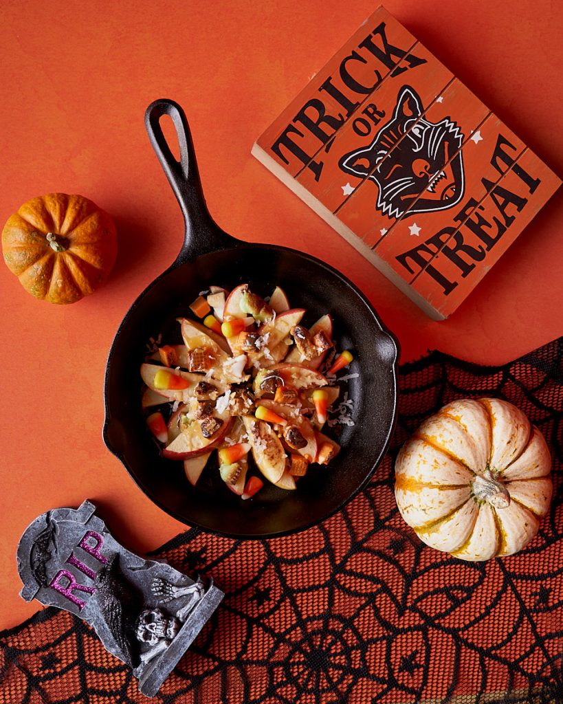 - Arrange apples in a cast iron pan. Top with assorted chocolates.