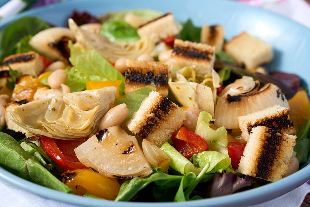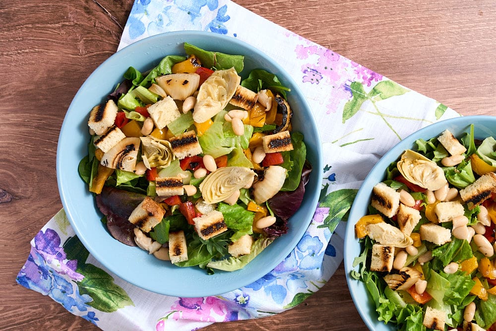 - Build your salad by mixing the greens, onions, bread, bell pepper, beans, artichokes, mozzarella, and prosciutto in large bowl. Toss the salad and coat with the vinaigrette.