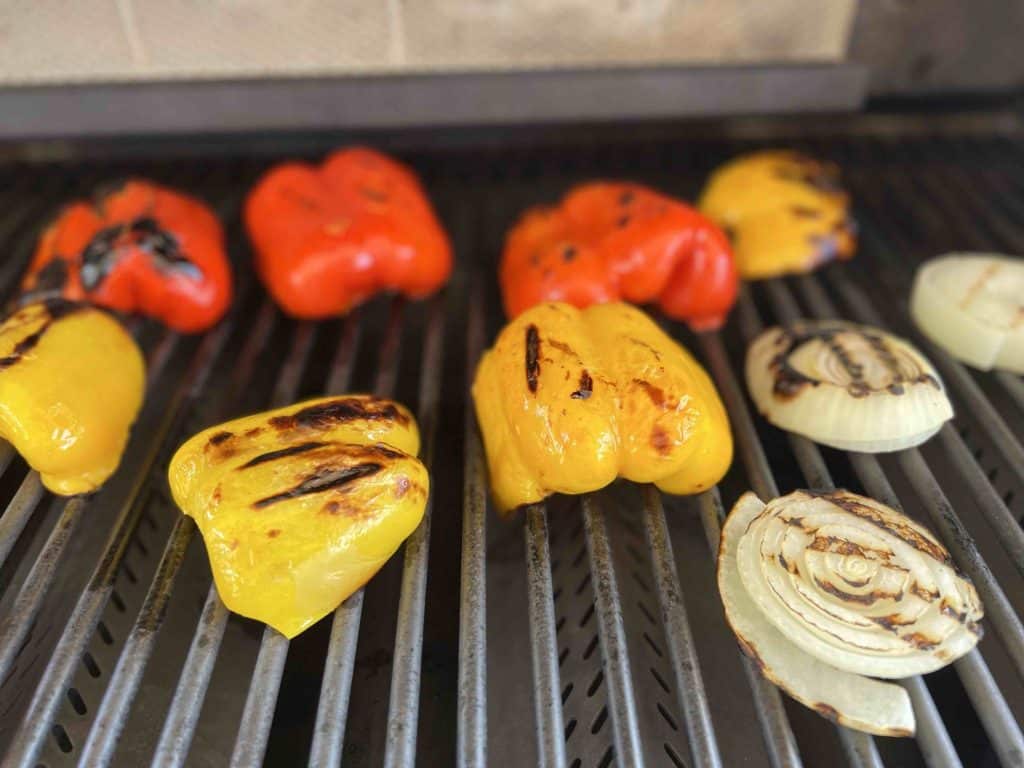 - Spray the bell peppers, onions, and bread with olive oil spray. Then grill them on a Bull Grill that has been preheated to medium-high. Grill the bread until it’s toasted and has grill marks on both sides. Grill the bell peppers and onions until the skin begins to char and grill marks appear.