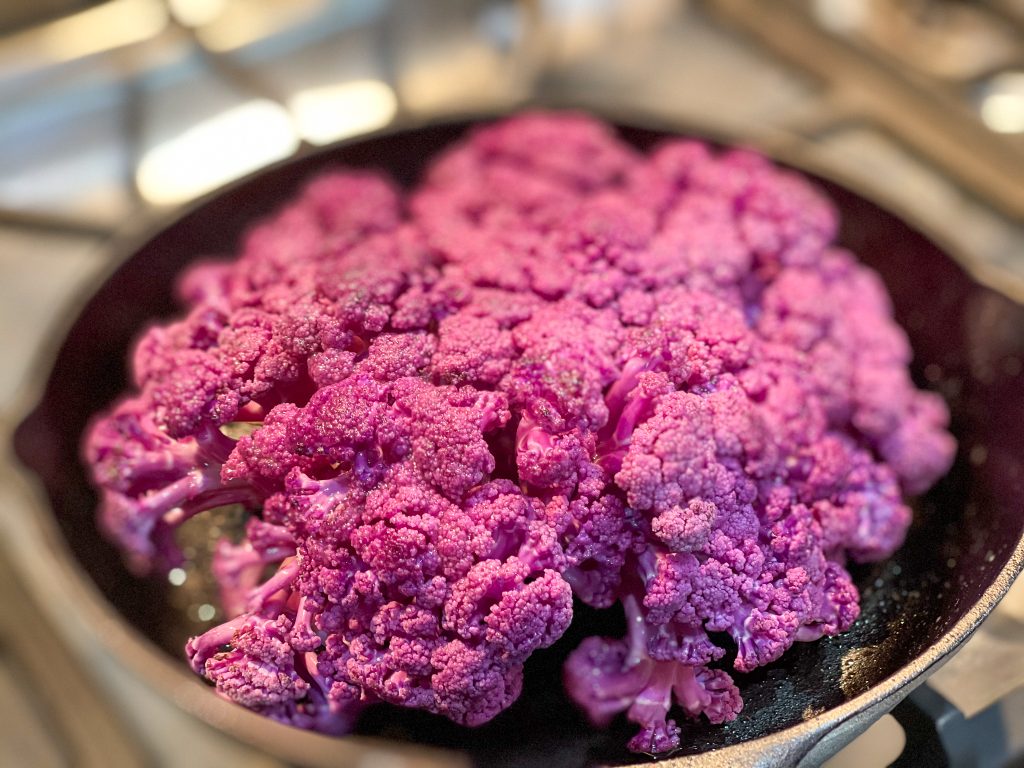 Purple cauliflower is considered a superfood and is charged full of antioxidants. It has a mild flavor with nutty nuances that really shine when grilled. The cauliflower doesn’t need much added to it although pairing with a little melted cheese or creamy dipping sauce is another way to serve it.