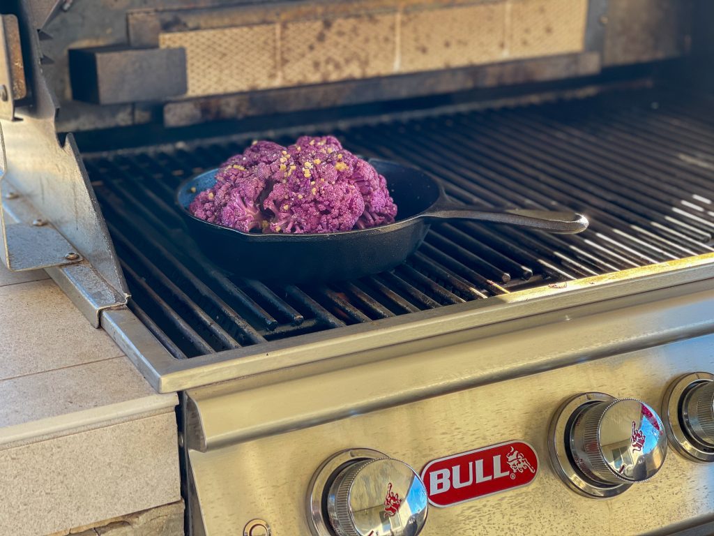 I normally use a combination of cast iron and indirect heat to cook the purple cauliflower on a Bull Grill. However slicing the cauliflower vertically into steaks and grilling over open fire is another awesome way to serve and cook it.