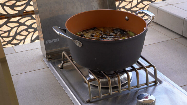 4. Remove tomatillos, peppers, and onion from grill and place in pot. Fill pot with water until tomatillos, peppers, and onions are barely covered with water. Bring to a boil on your Bull Side Burner and reduce to a simmer for 10 minutes.