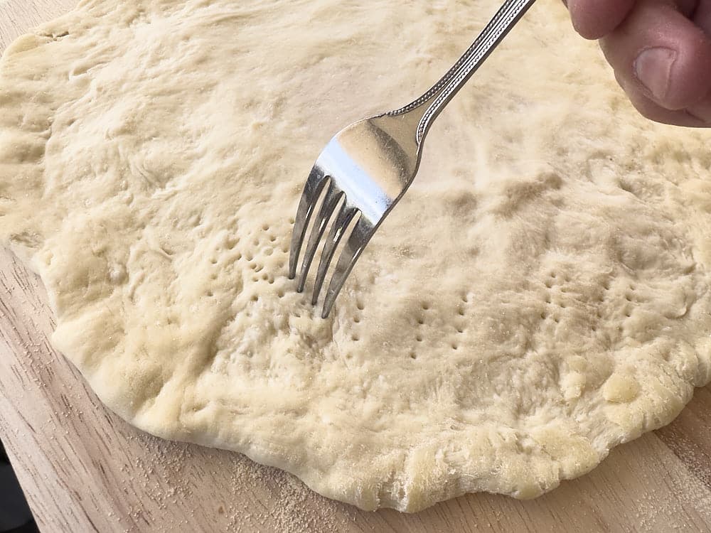 - Prepare the Basic NY Style Pizza Dough according to the recipe. Stretch the pizza dough and place it on your semolina-dusted pizza peel. Use a fork to lightly poke 20-30 holes in the dough and set aside.