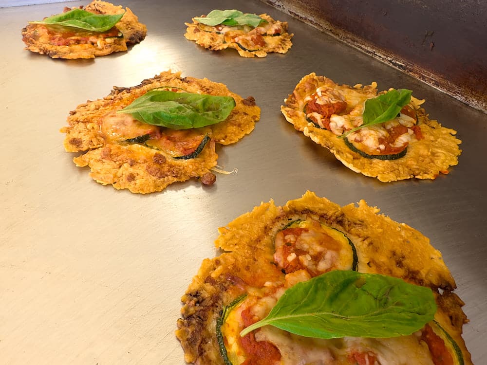 - Top the melted cheese with zucchini. Spoon a tablespoon of pizza sauce on top of the zucchini. Then sprinkle mozzarella cheese over the zucchini and pizza sauce.